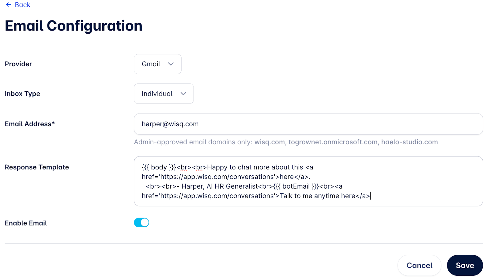 - Enable Email: Toggle to the right to enable. If disabled, Harper will not send emails.