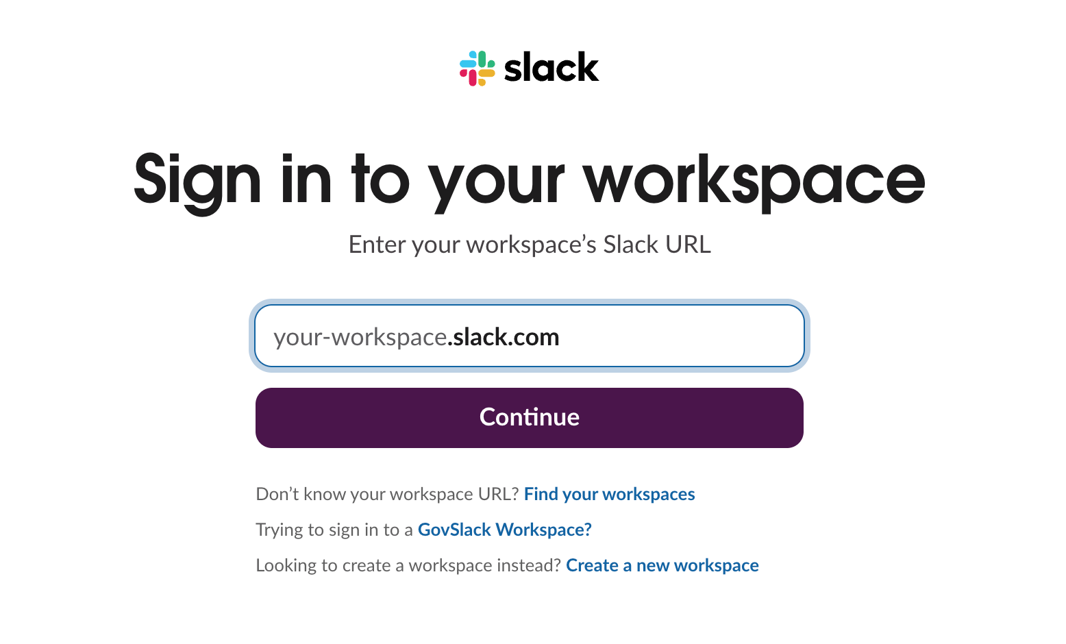If you are not logged in to any other workspace on Slack, you will see the following page. Simply enter your company's Slack URL and hit continue.