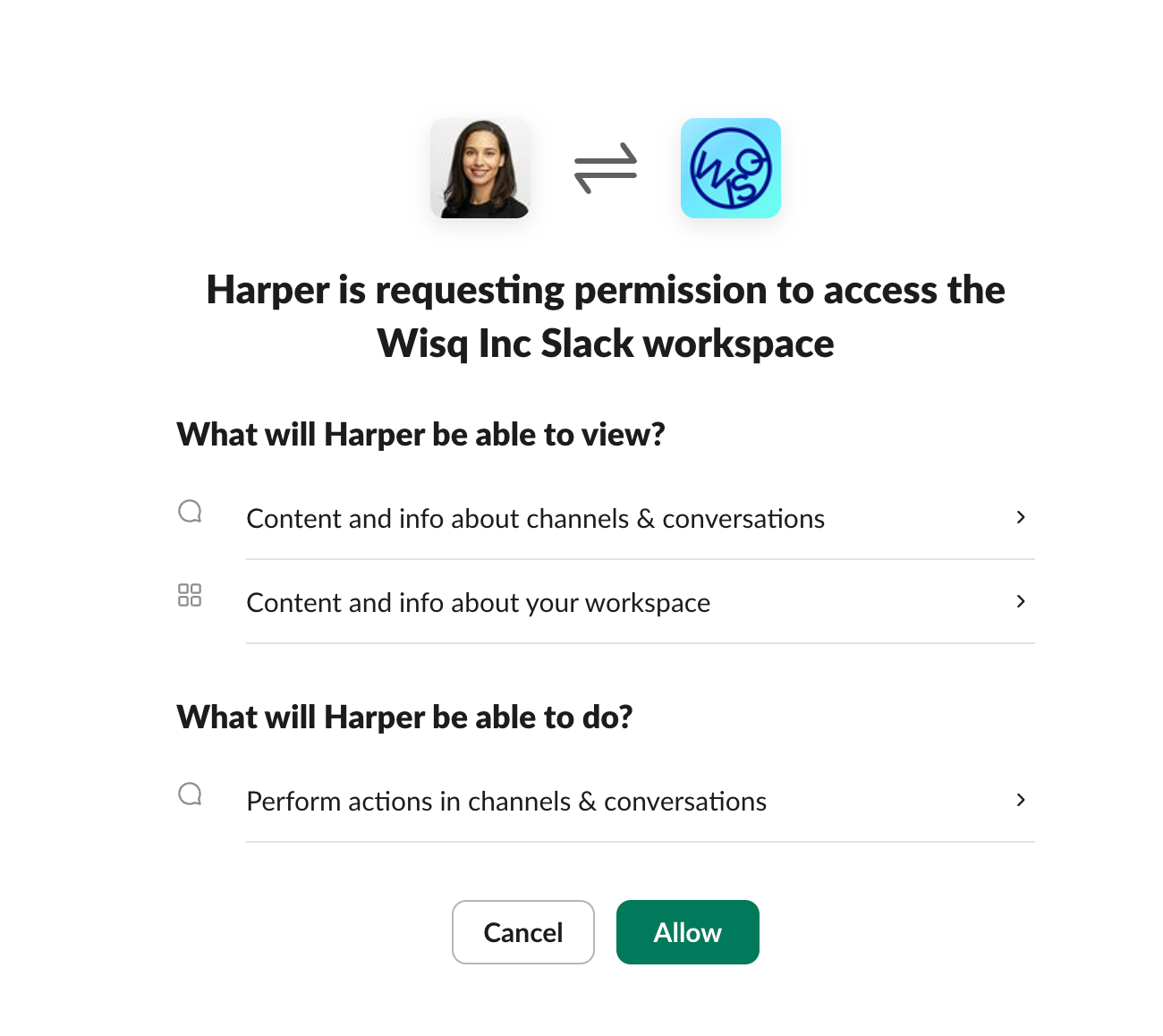 To enable your employees to engage with Harper over Slack, we’re asking you to install the Wisq app in your Slack Workspace. If you have any questions about these steps, please contact your Wisq Customer Success Manager for assistance.