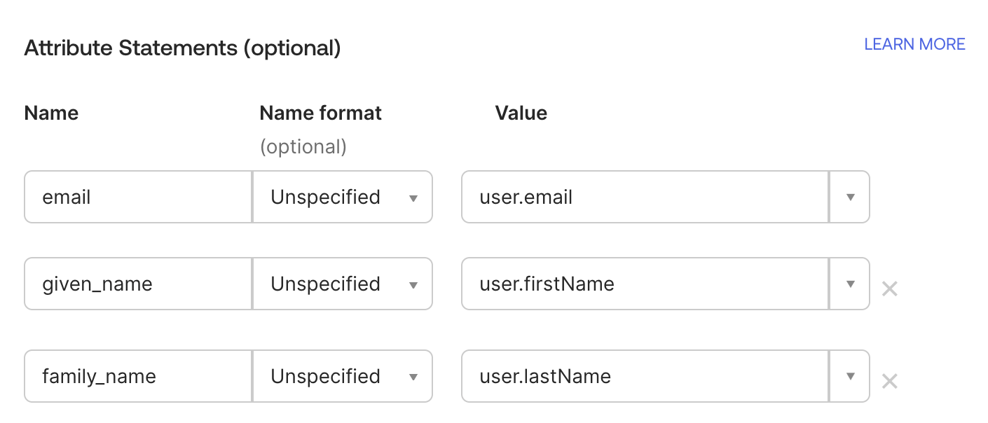 Add the following to Attribute Statements. They are required for SSO to work, and are case sensitive. If Wisq has discussed additional statement attributes, please add them here.